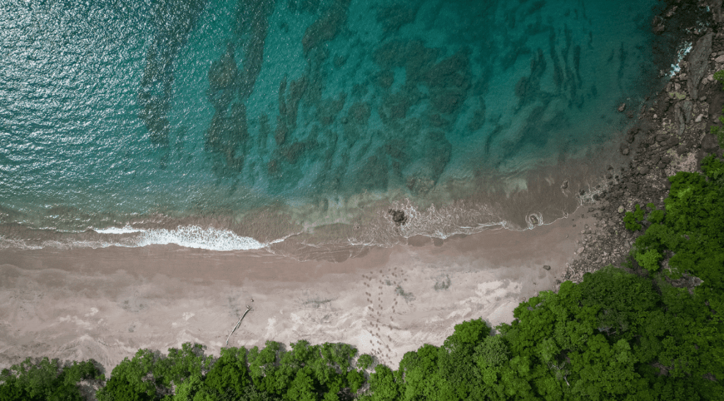 To your right, the beach stretches on, curving gently toward a small peninsula of jagged rocks, its surface covered in green leaves. Beyond them, something catches your eye; a vertical shape rising above the outcrop, contrasting starkly against the horizon. It’s faint, but unmistakable: the skeletal outline of a ship’s mast, reaching skyward like a ghostly finger. It stands tall and still, a silent witness to whatever tragedy brought it here, evoking a sense of lost journeys and untold stories waiting to be unraveled. The gentle lapping of waves against the shore seems to whisper the secrets of the sea, as if the very ocean mourns the fate of the vessel that once sailed these waters.