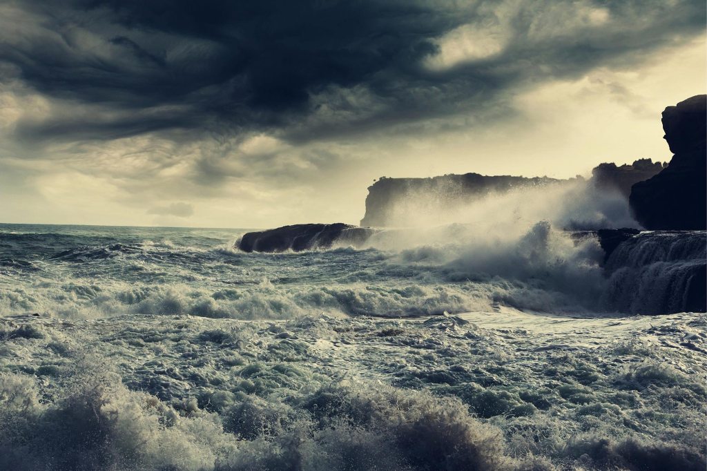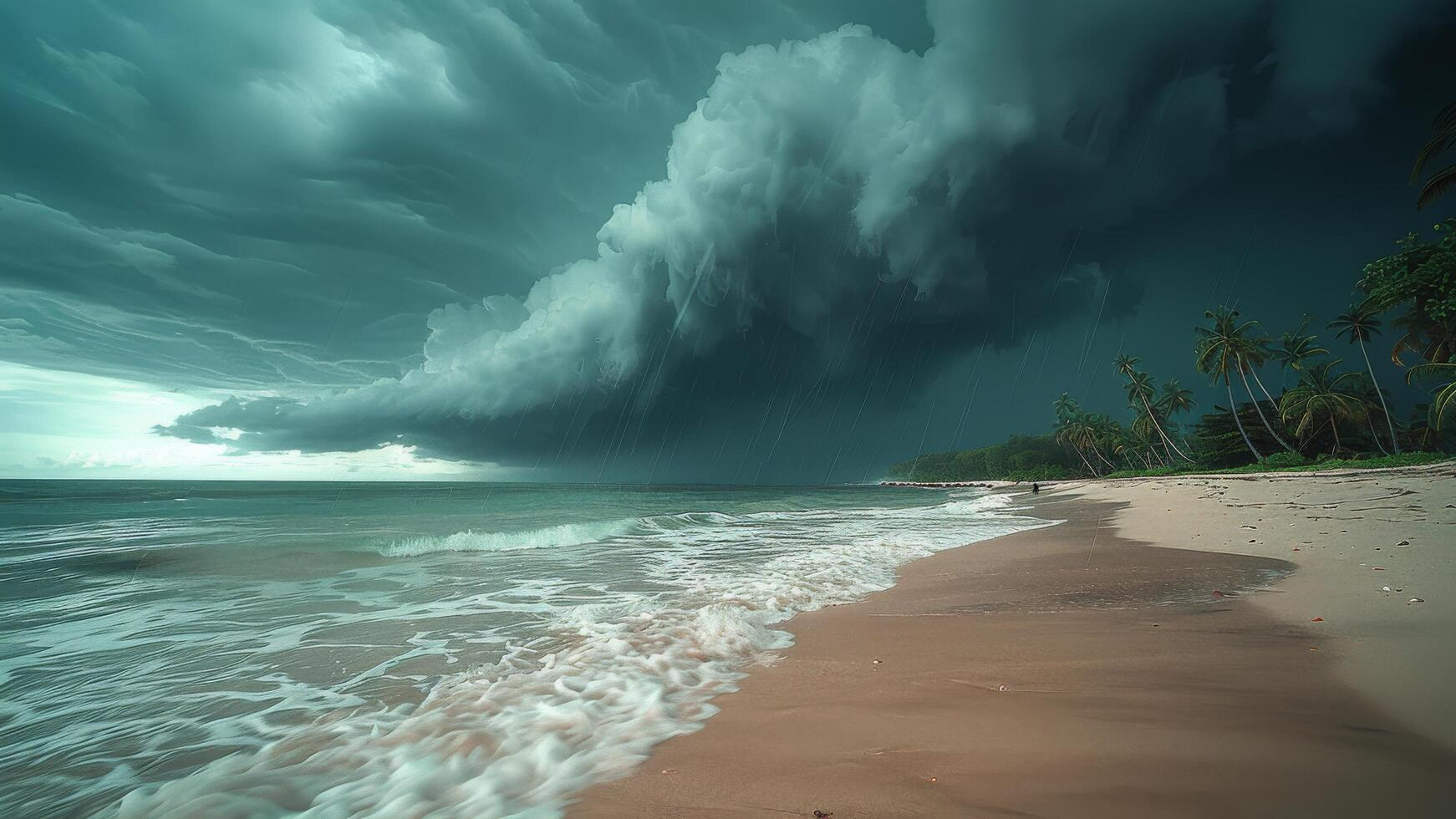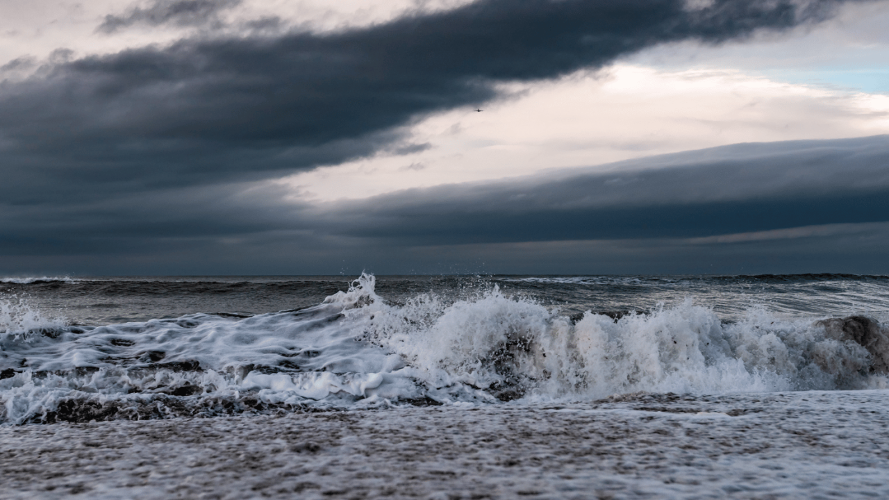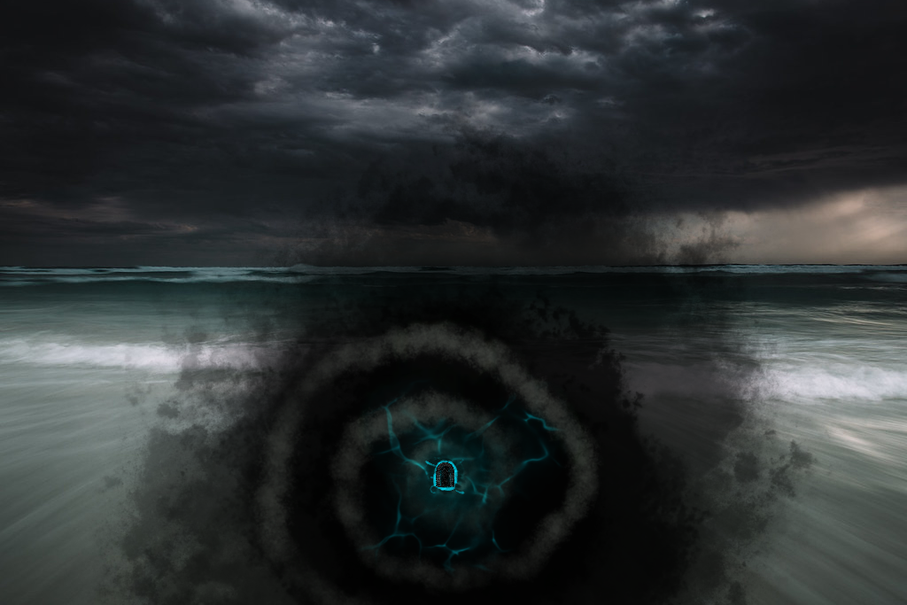 You barely have time to think before a massive wave crashes into you. Salt water stings your skin, and the impact sends you sprawling into the sand. The shoreline—wasn’t it farther away just a moment ago? Another wave crashes, closer still, and rain begins to fall in thick sheets, blurring your vision.