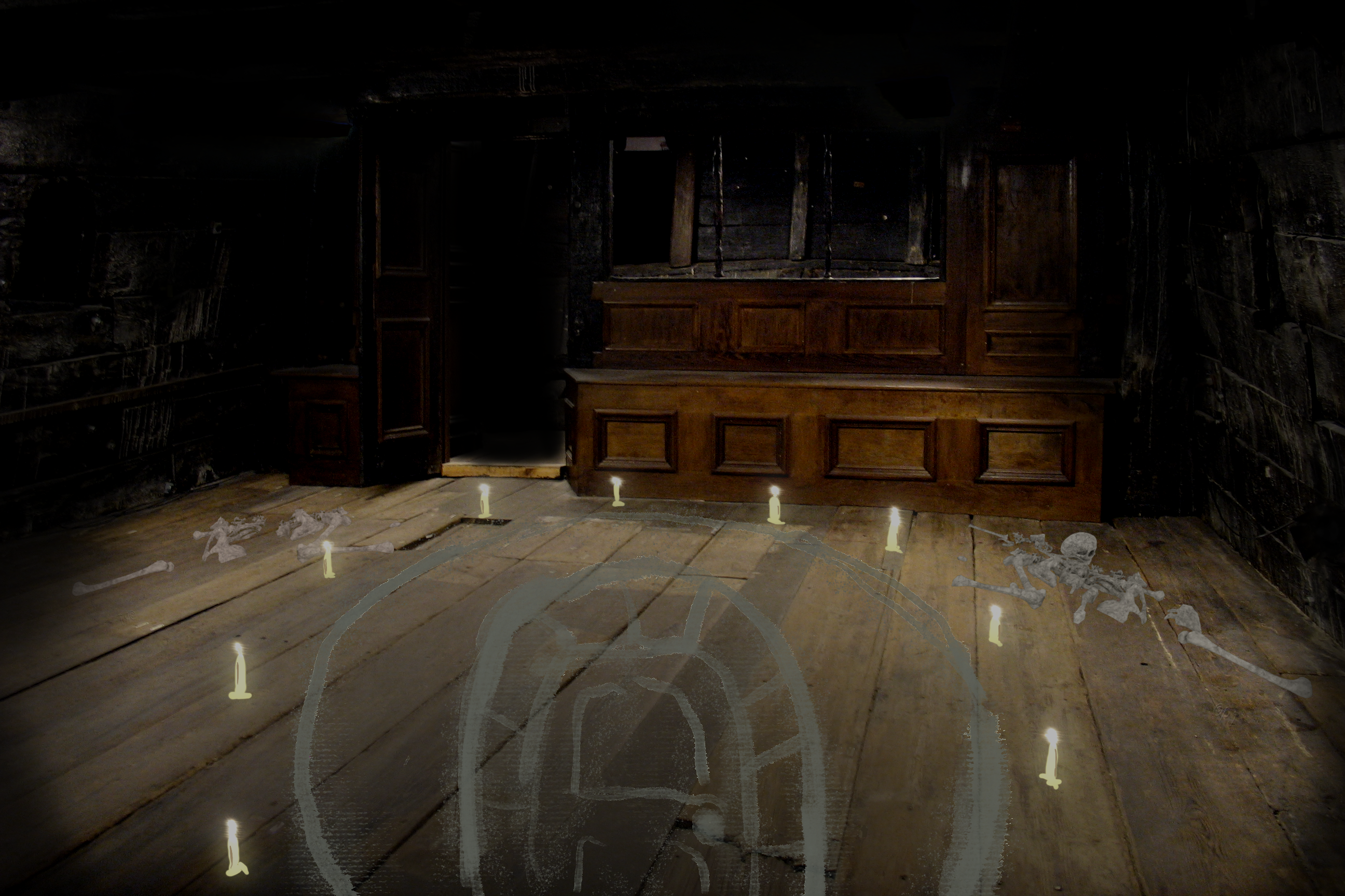You, along with 11 others, enter the wreckage of the ship lured by the promise of shelter, supplies, and the twisted allure of the unknown. The stench inside is overwhelming, a mixture of decay and something more foul, as if the ship itself has been corrupted. Amidst the flickering light of candles which shouldn’t have been lit, your gaze falls upon scattered human bones—some broken and pulverized into a fine dust. That dust is artfully arranged into a grotesque mural, its centerpiece in the shape of a door, surrounded by a large circle, then surrounded again by the dim light of candles.